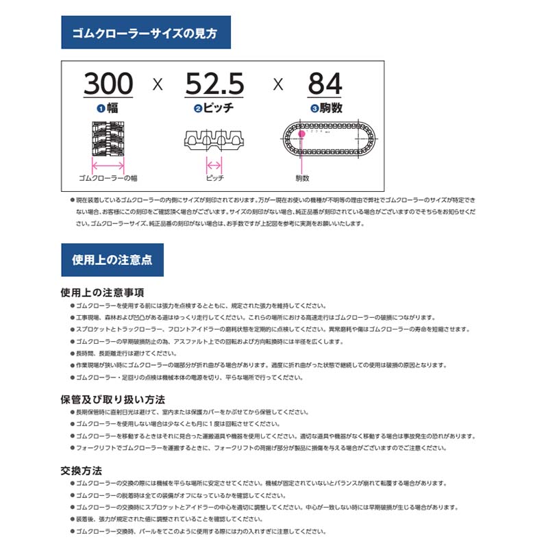 ゴムクローラの内側に打刻されているサイズ(幅×ピッチ×コマ数)をご確認お願いします。
