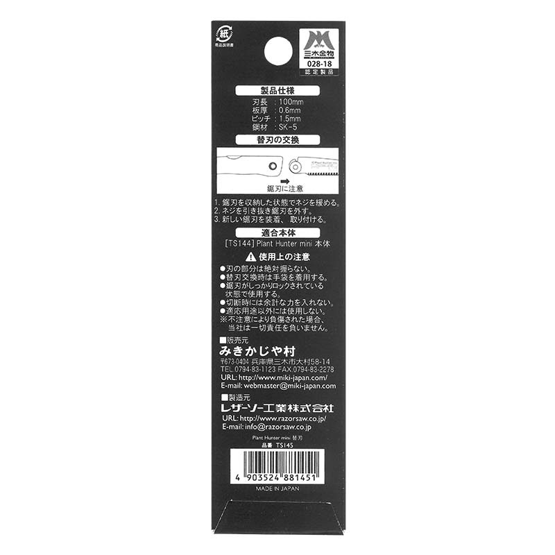 替刃のみ のこぎり プラントハンター ミニ 替刃 TS145 みきかじや村 枝切鋸 折込鋸 鋸 ノコギリ 替刃式 園芸 アウトドア 三冨D