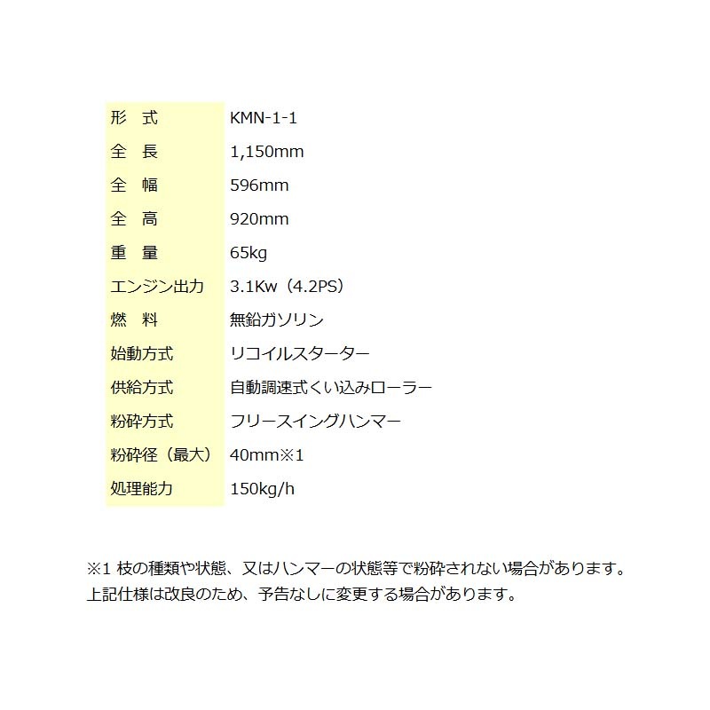 樹木粉砕機 ベビーシュレッダー KMN-1-1 粉砕機 シュレッダー エンジン式 フリーハンマー 樹木 粉砕 カルイ オK 個人宅配送不可 代引不可