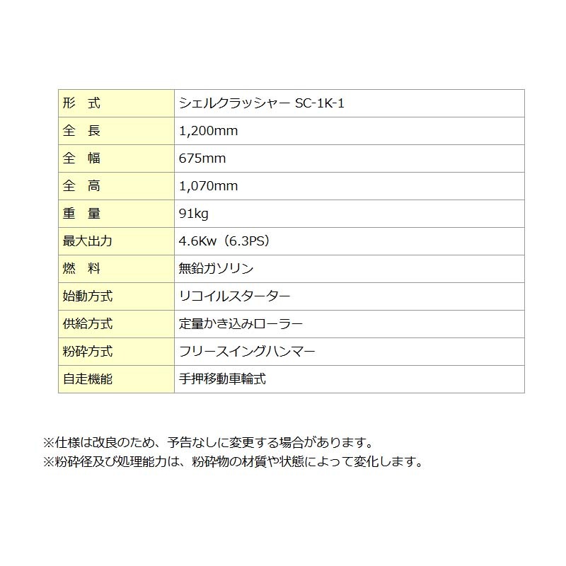 多目的粉砕機 シェルクラッシャー SC-1K-1 粉砕機 特殊粉砕機 手押し式 フリーハンマー 樹木 貝殻 ゴミ 飼料づくり 粉砕 カルイ オK 個人宅配送不可 代引不可