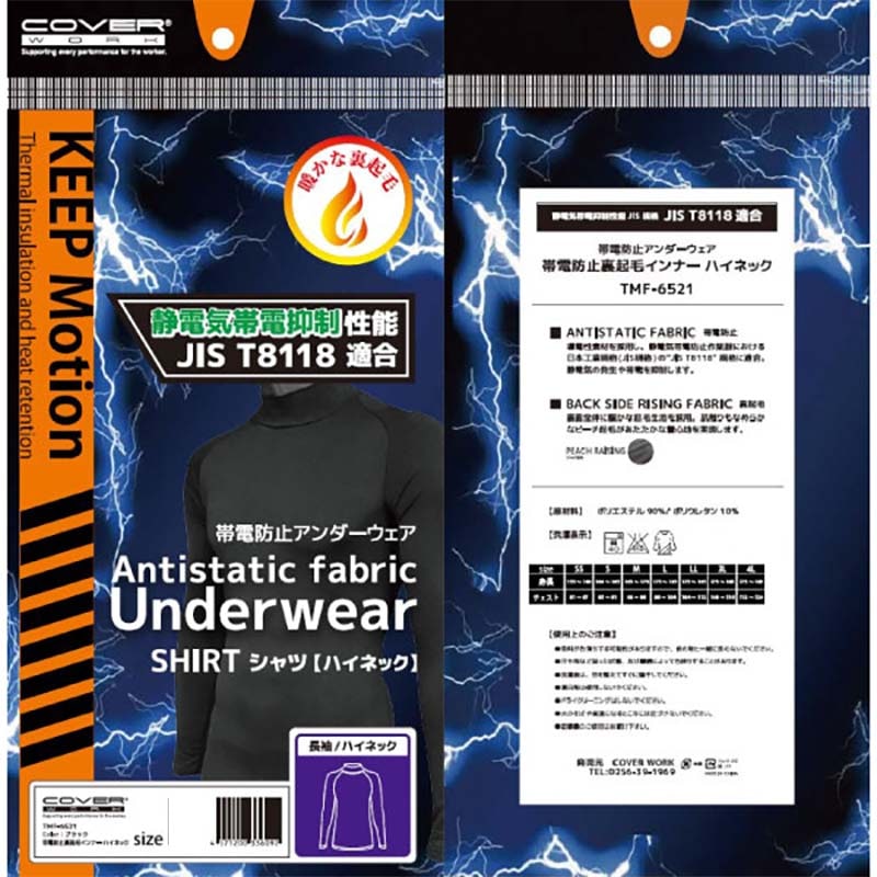 防寒ウェア 帯電防止裏起毛インナー ハイネック TMF-6521 黒 メンズ インナー 防寒 保温 冬 アウトドア スポーツ 除雪 作業 カヴァーワーク D