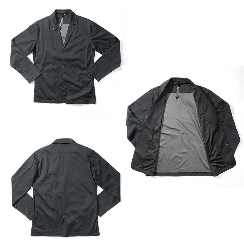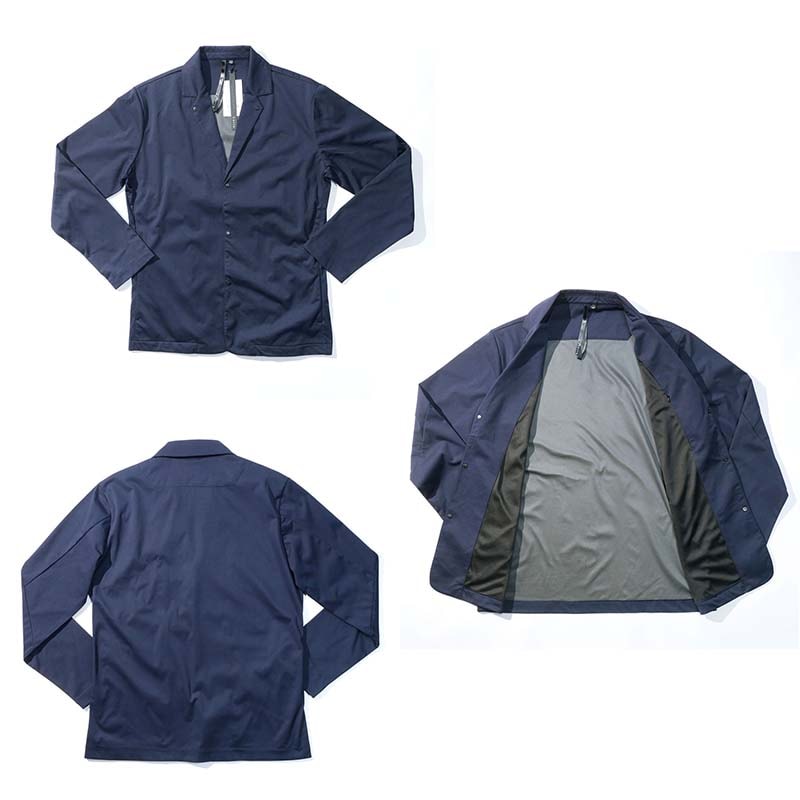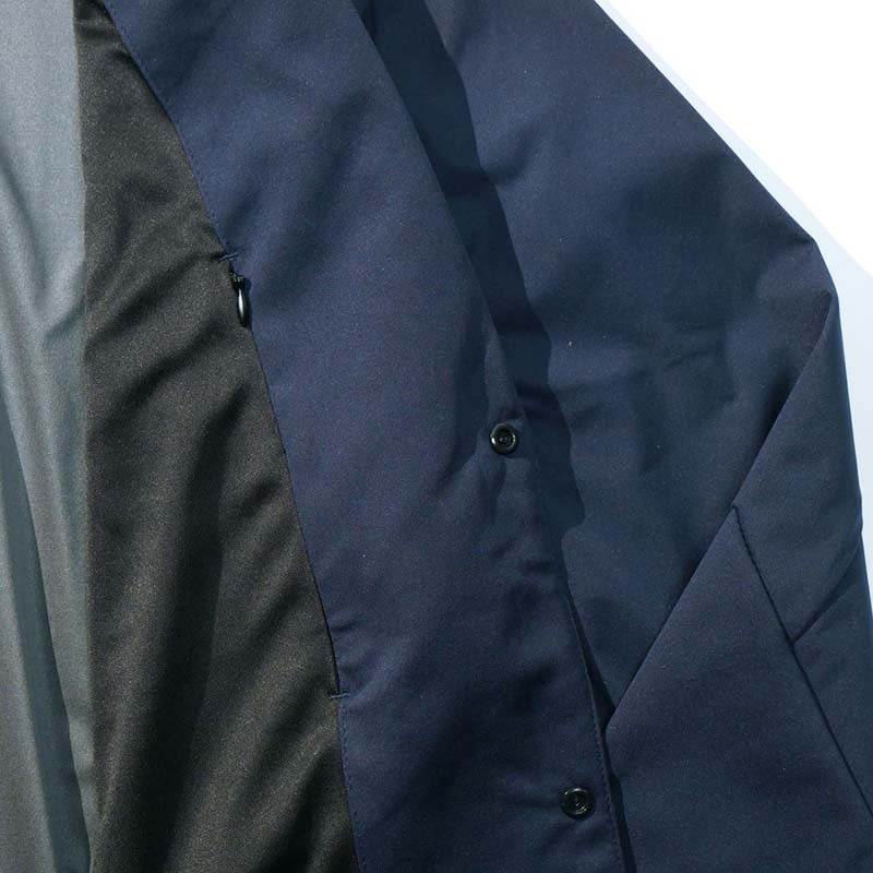 襟元のボタンを開くことでテーラードジャケットとして、襟元のスナップボタンを締めることでブルゾンとして、二通りのシルエットでシーンに合わせてご着用いただけます。