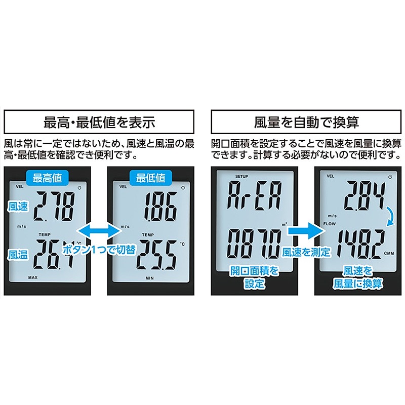 開口面積を設定することで風速を風量に換算できます。計算する必要がないので便利です。