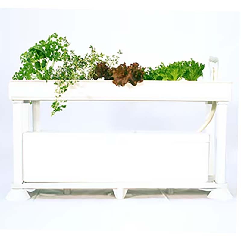 葉菜用水耕栽培キット「ホームハイポニカPLAABO(プラーボ)」は上段に栽培槽を、下段に液肥槽を配した2段スタンド式構造。