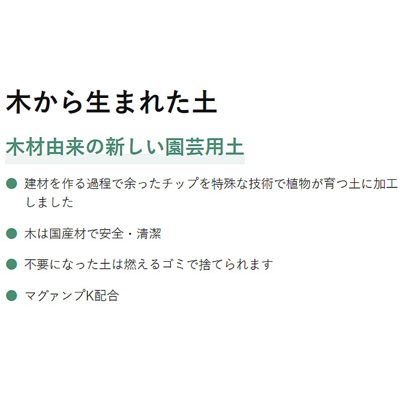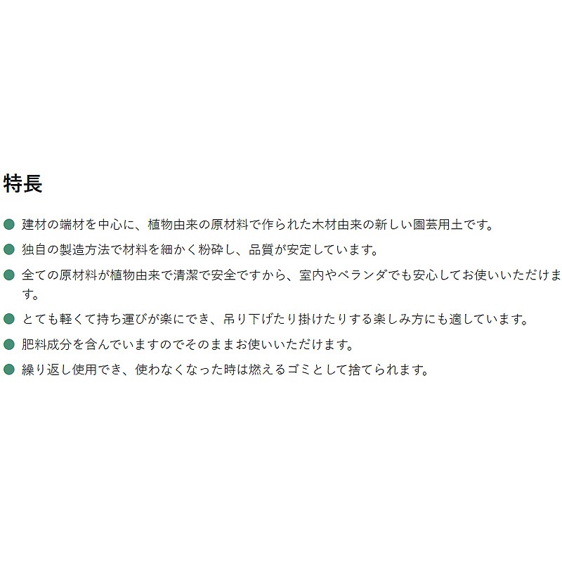 ・建材の端材を中心に、植物由来の原材料で作られた木材由来の新しい園芸用土です。